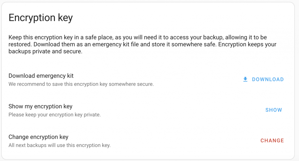 Zuerst wird euch ein Key angezeigt, mit dem die Backups verschlüsselt sind. Den bitte gut weglegen, ausdrucken, in den Safe legen oder in den Passwort Manager. Der Key lässt sich später aber auch noch herunterladen oder ändern (für neue Backups). Siehe unten.